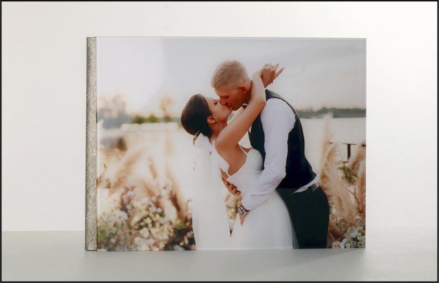 Tapa con fotografía en acrílico cristal y material en trasera y lomo a escoger.