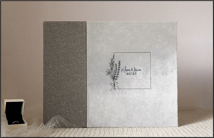 Tapa con dos materiales e impresión de greca en el lado derecho.