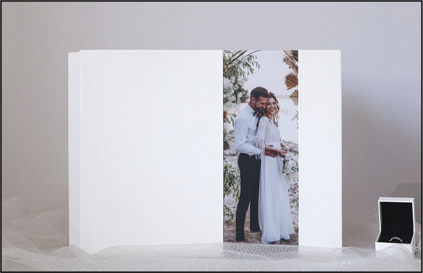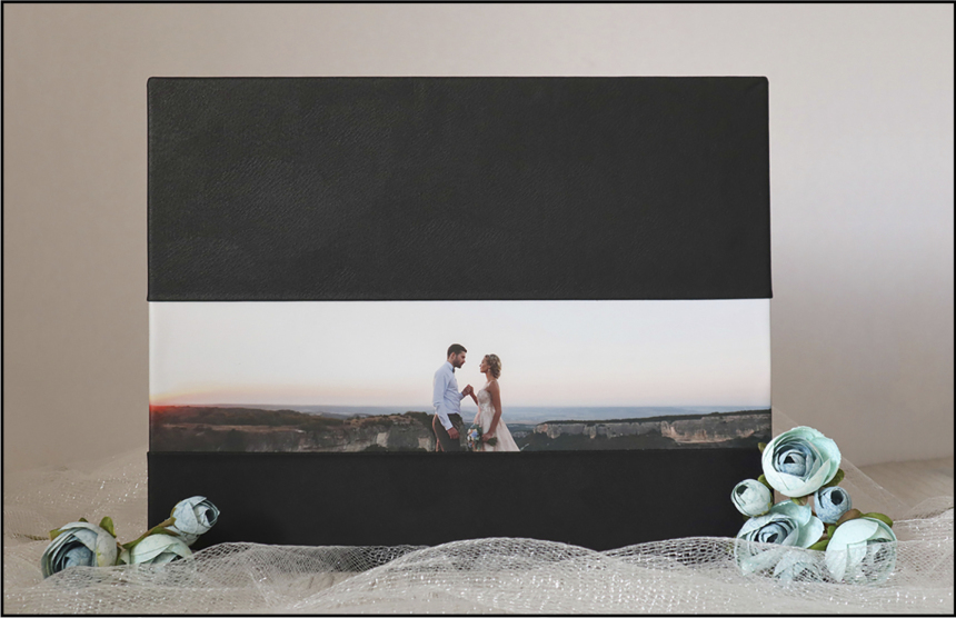 Tapa con fotografía horizontal en el lado inferior y material a ambos lados a escoger.