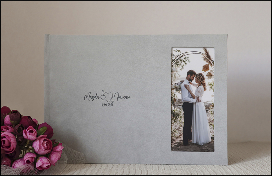 Tapa con ventana vertical y fotografía en el lado derecho y materiales a escoger.