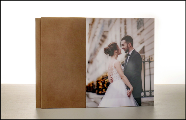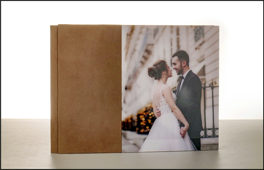 Tapa con fotografía vertical en acrílico cristal en el lado derecho y material en lateral izquierdo y trasera a escoger.