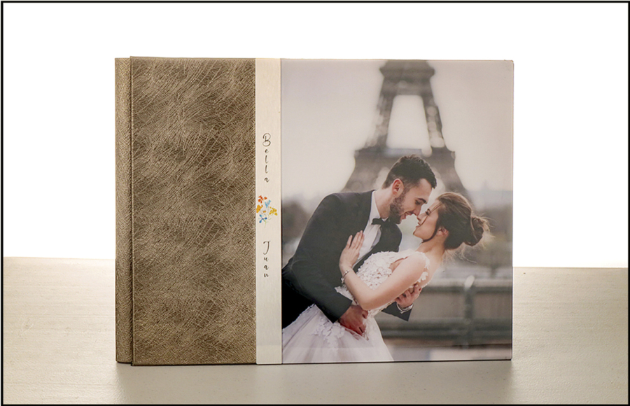 Tapa con fotografía en acrílico en el lado derecho y tira de aluminio con impresión de diseño.