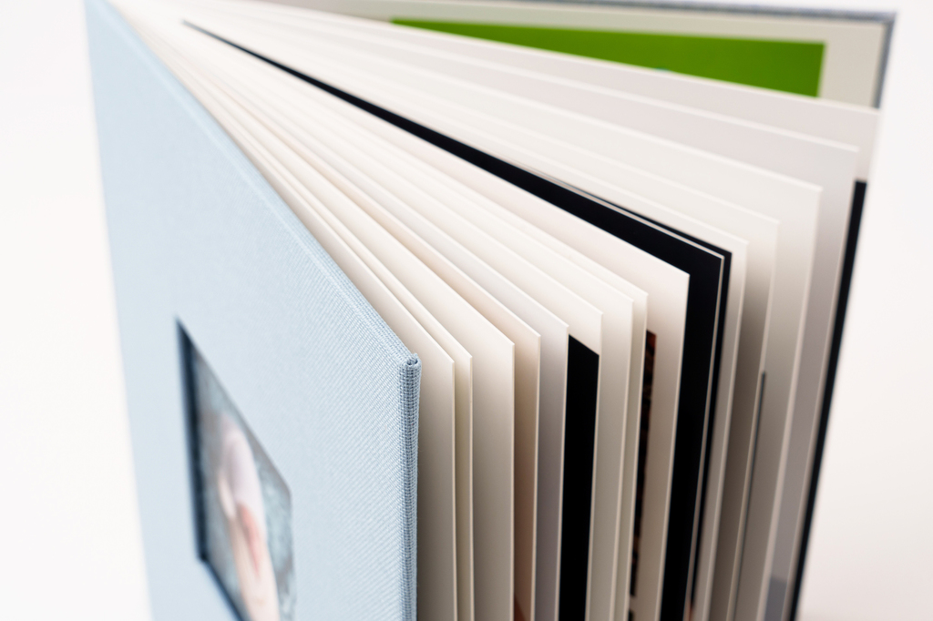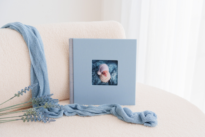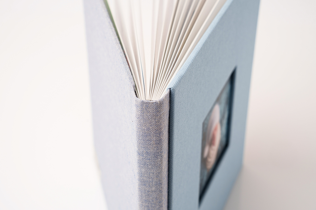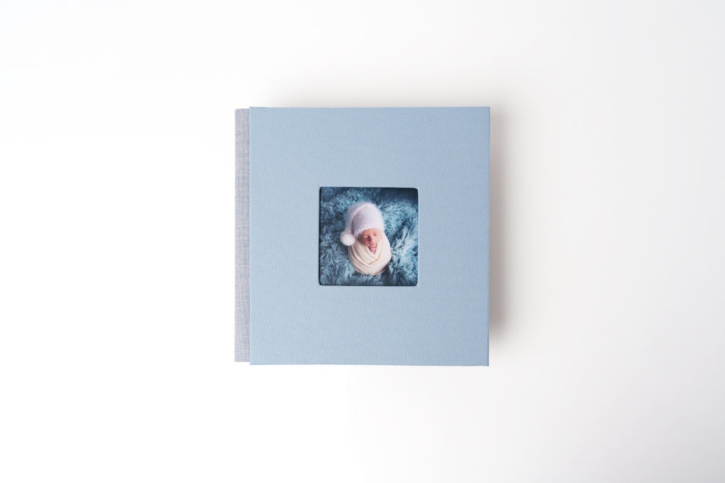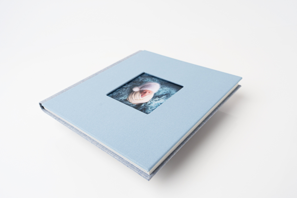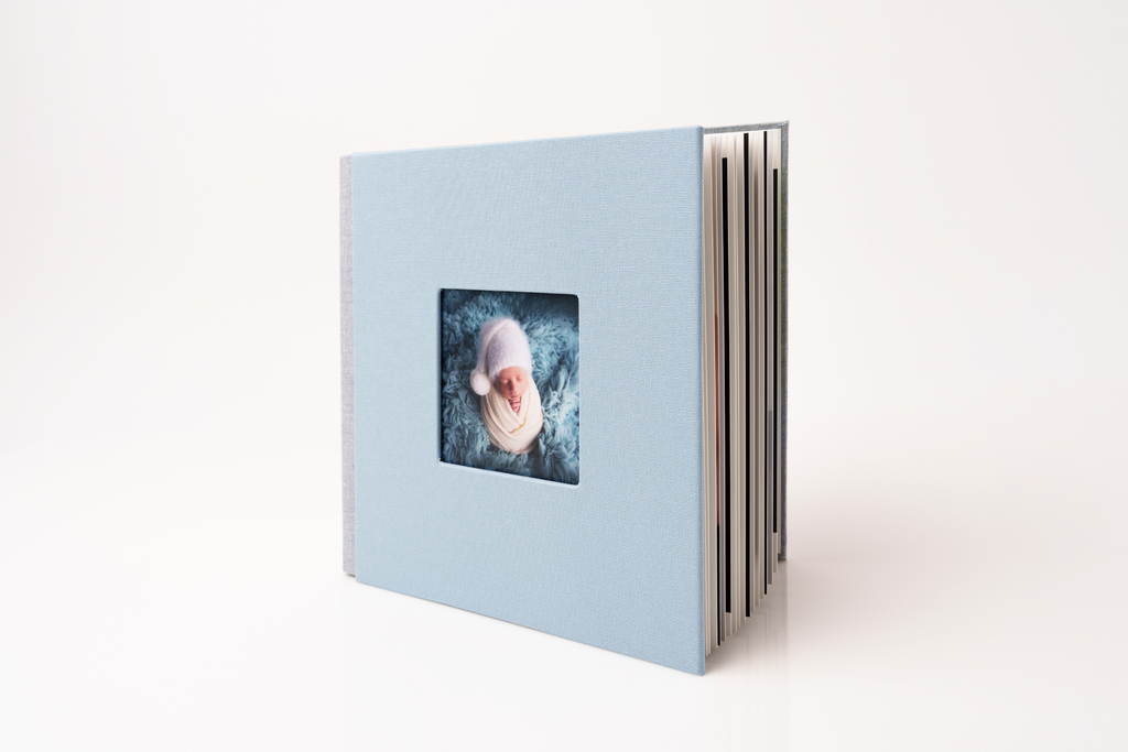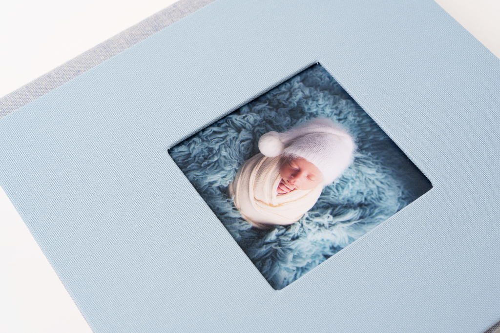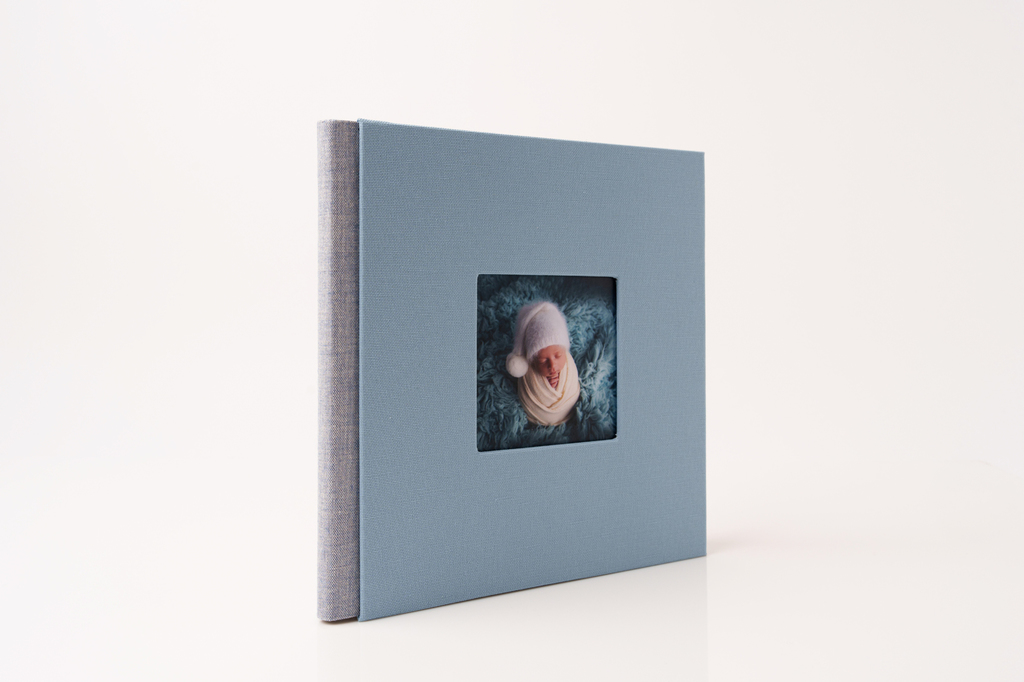 Álbum con fotografía cuadrada central y materiales diferentes en cubierta y contracubierta.