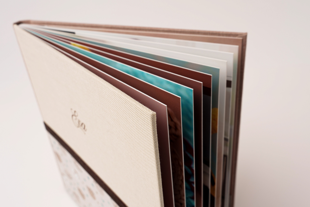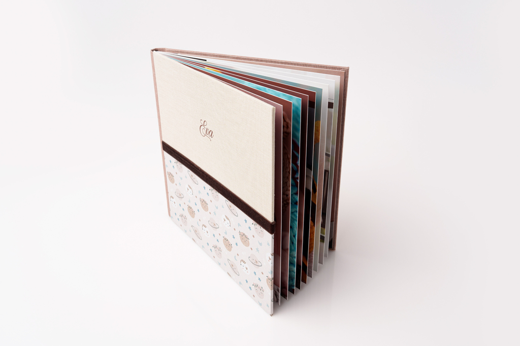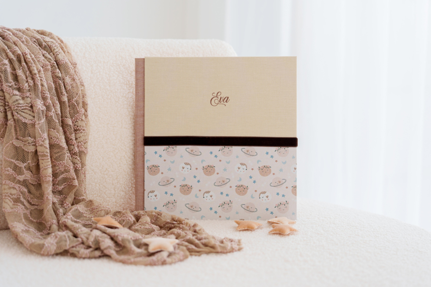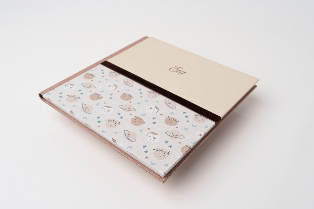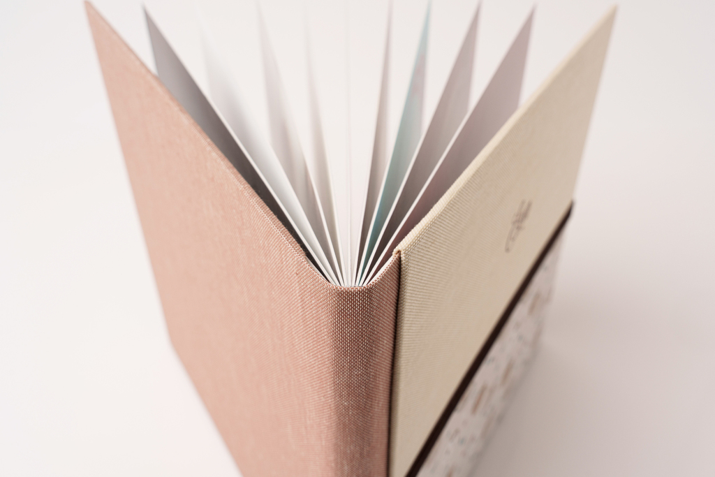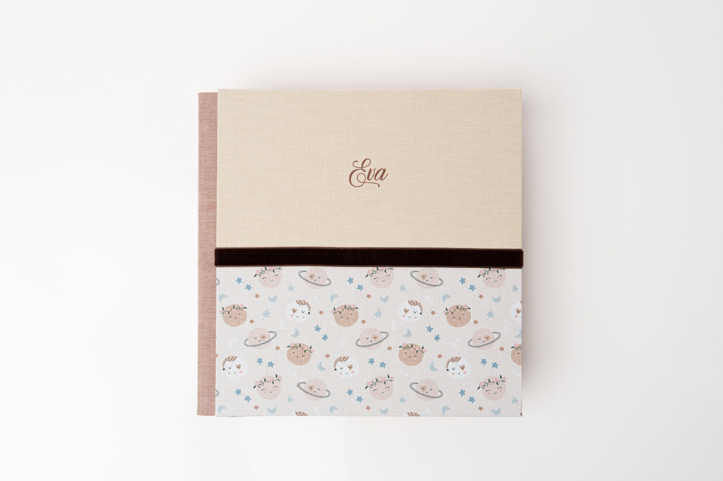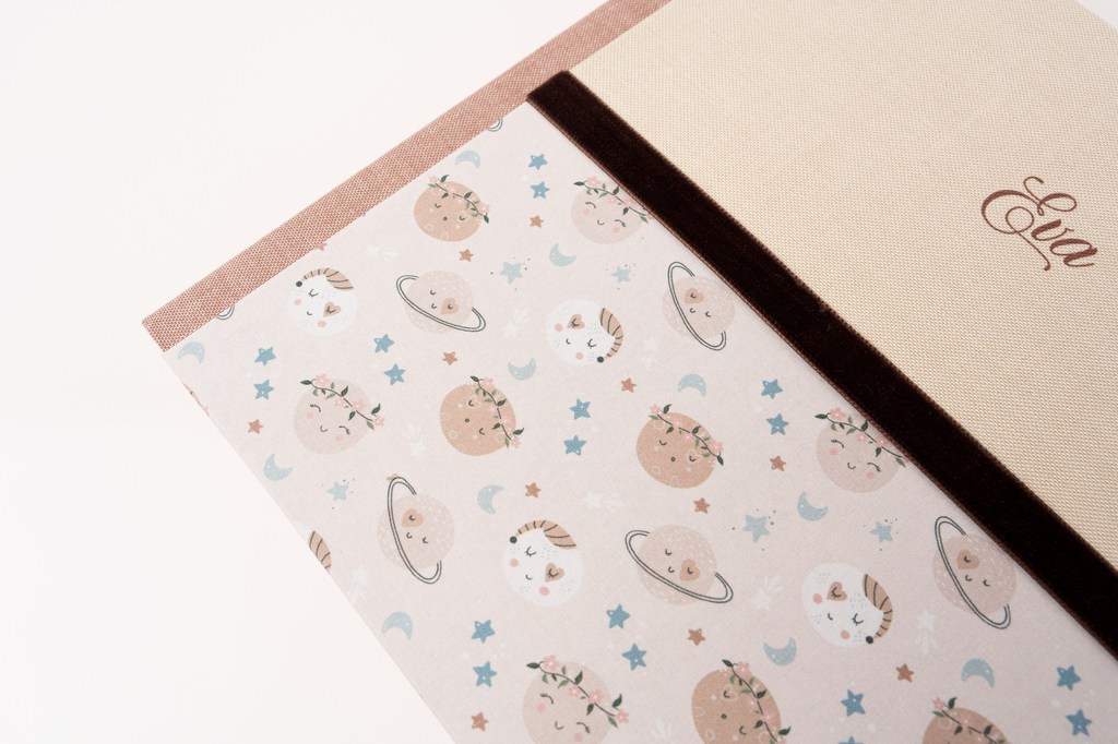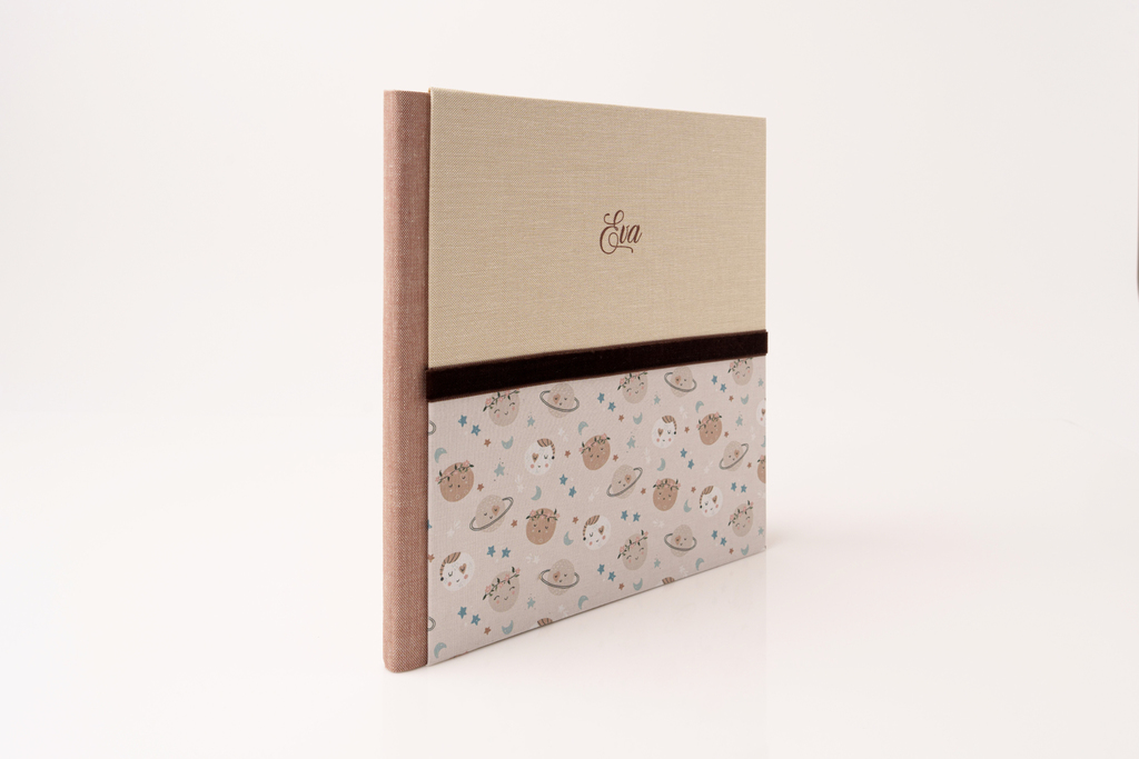 Álbum que fusiona materiales y texturas: material con grabado UV arriba, banda de terciopelo en el centro y material con patrón en la parte inferior.