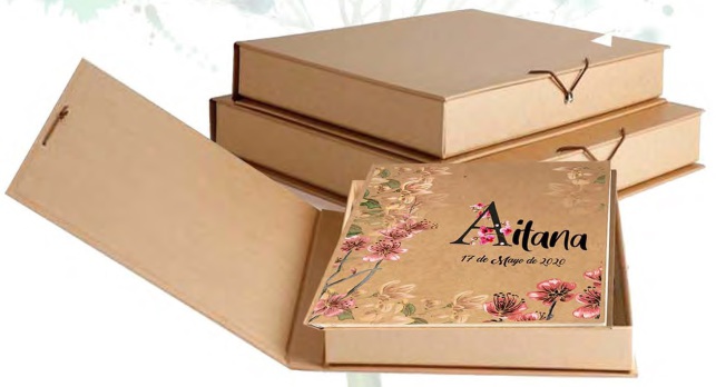 Álbum fabricado en 1 sola pieza en material Kraft, biodegradable. Tamaño 30x30 con 10 pliegos impresos en papel fotográfico. Con diseño de portada a elegir entre 7 modelos.