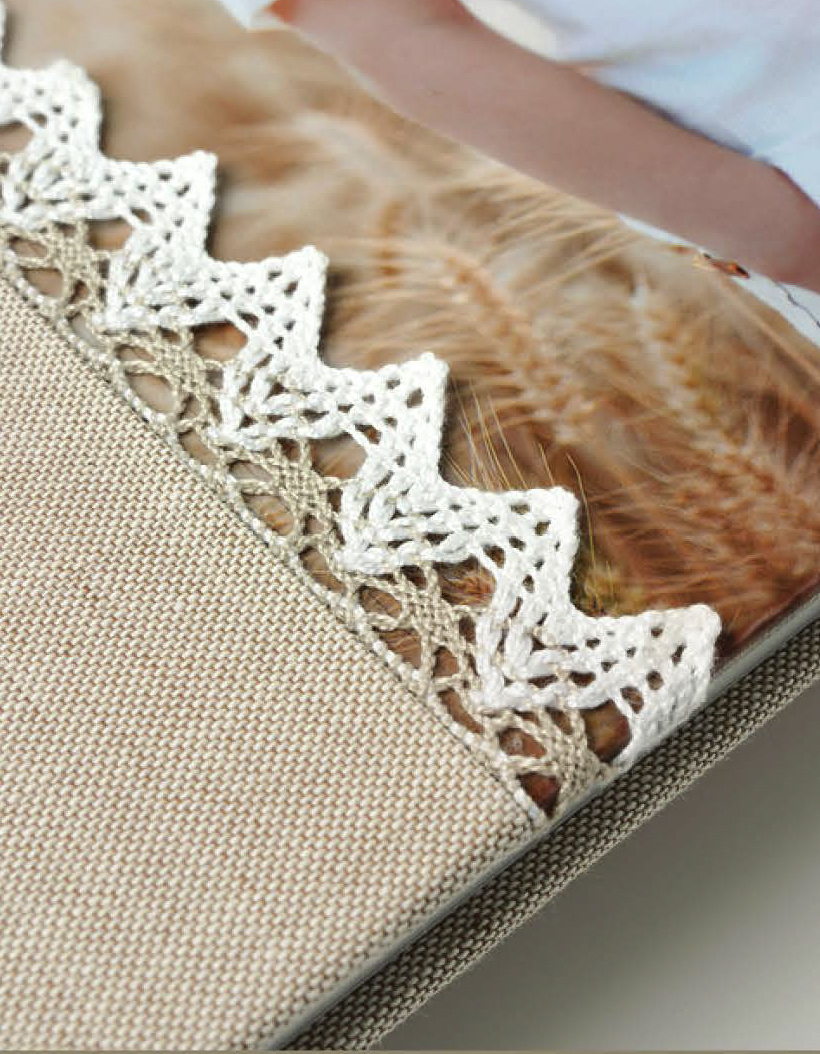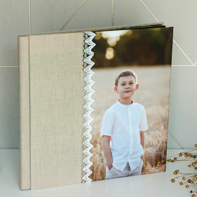 Modelo con fotografía laminada en el lado derecho, material en el izquierdo y en el centro una franja con bordado.