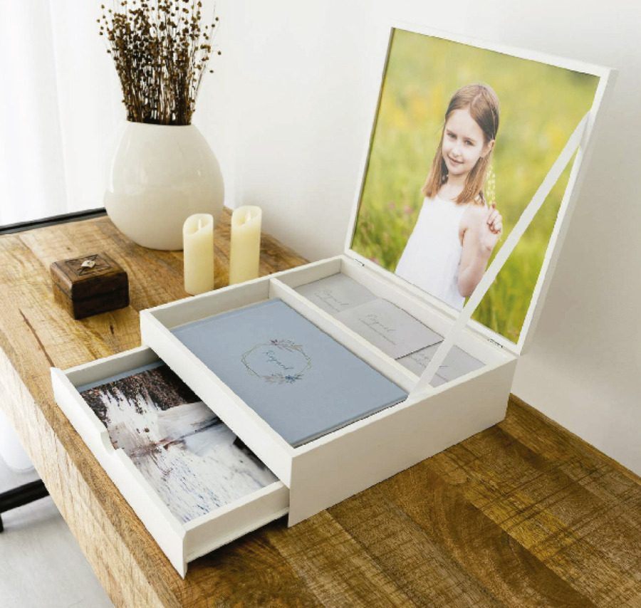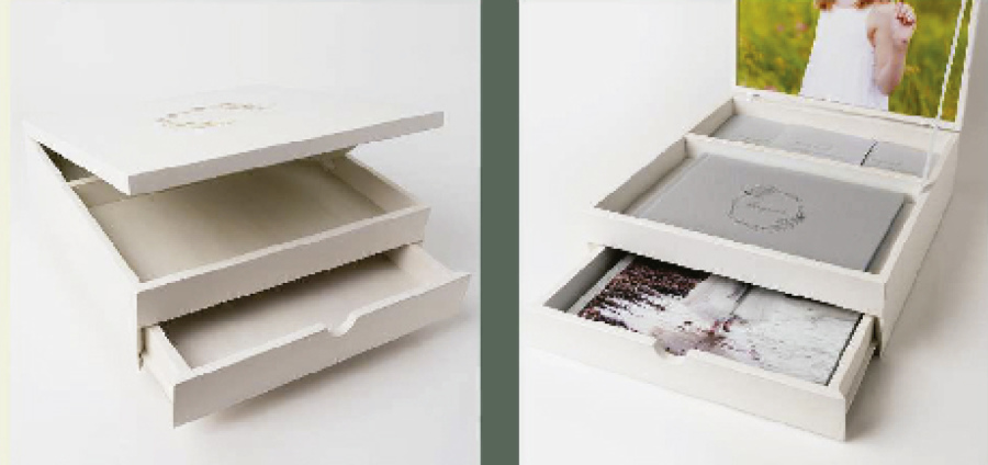 Caja de madera con dos pisos. Con fotografía en la parte interior e impresión UV en la parte exterior.