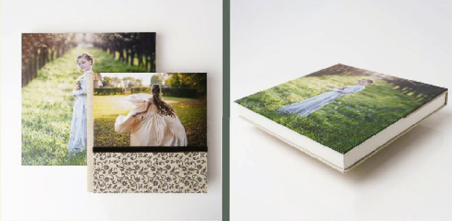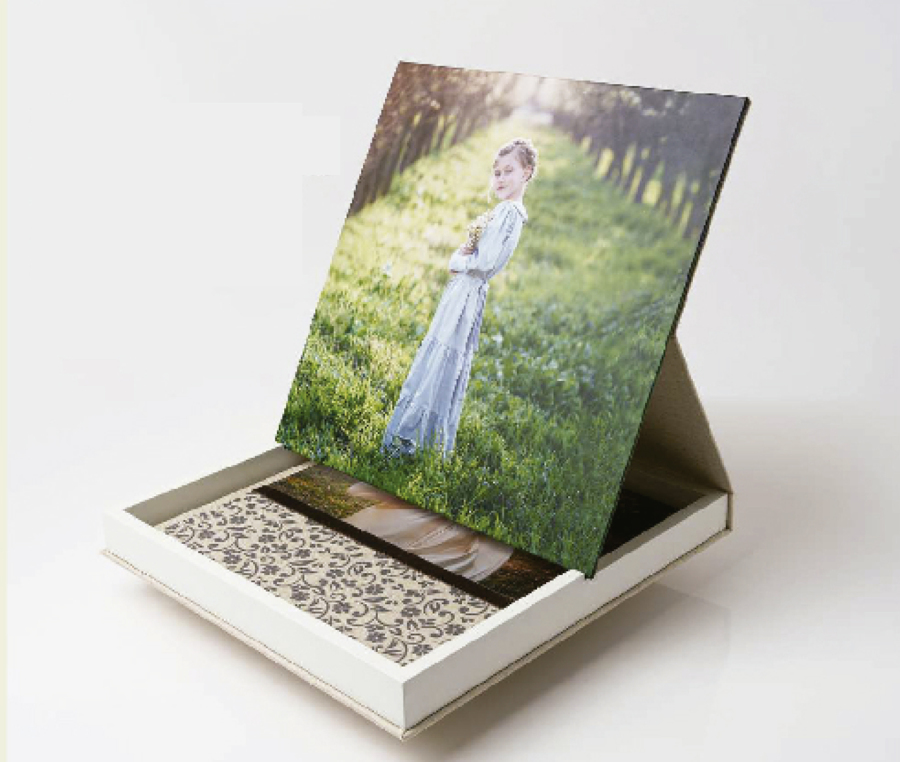 Caja con aros de madera y fotografía en la parte superior que puede servir como marco.