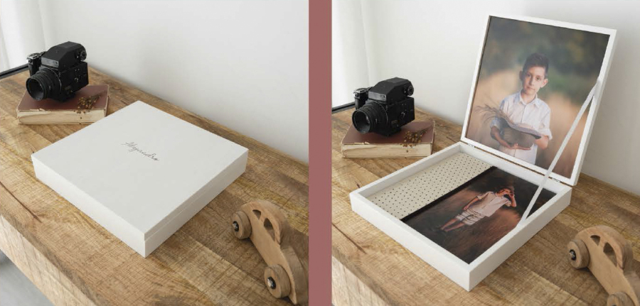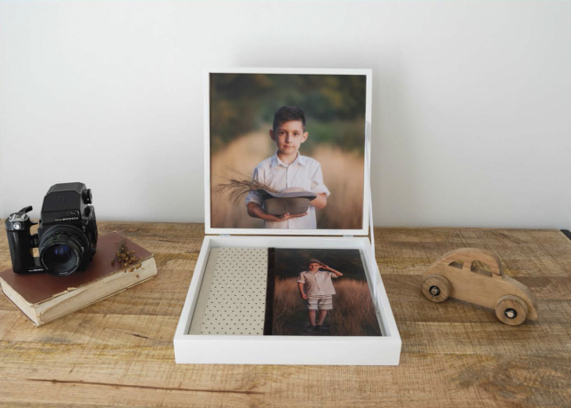 Caja de madera con fotografía en la parte interior, e impresion UV en la parte exterior.